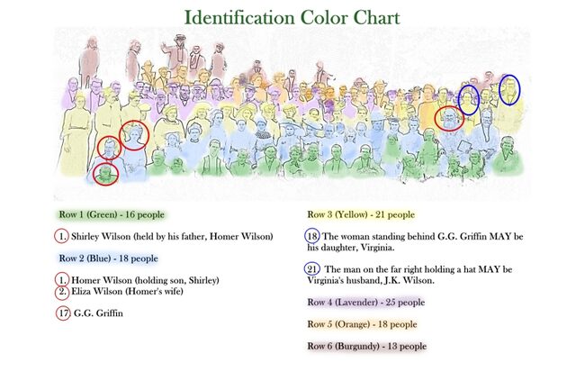 If you can help us positively identify any of those pictured, please contact Bobbi Spiker Conley. Simply refer to the Row Number and Row Color, then the person’s Position in that row, from left to right. For example, Row 2/Blue/Position 17 is George Granville Griffin (1828-1909.)