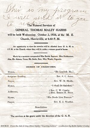 1 Oct 1906 – Gay Zinn – ”General Harris diedSaturday night at 12 o’clock and will be buried Wednesday 2 o’clock. The Old Soldiers are going to bury him.” Then on 3 Oct 1906 Gay wrote, “Tuesday there was an educational speech at the Court House and yesterday was General Harris funeral and there was a crowd of people in town.
