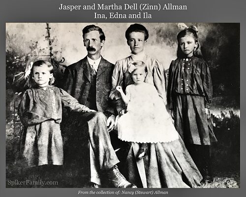 EDITOR’S NOTES regarding the children of Martha Dell Zinn and Jasper Sylvester Allman Sr. per conversations with Nancy Stewart-Allman — Ina Allman-Cole (1901-1921), Edna Allman (1904-1923), Ila Allman (1896-1918) and Marion “Bukey” Allman (1909-1939) all died of Tuberculosis.