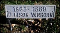 Homer Wilson told that, at the age of 16, he helped dig the first grave in the cemetery - that of his cousin, Allison VanHorn. He planted a cedar shrub to mark the grave, and there it remained for 70 years. In 1959, it was cut down and replaced with a small bronze plate. - There are dates of death on several tombstones which pre-date the cemetery’s establishment in 1889; those bodies were moved here from other burial places.