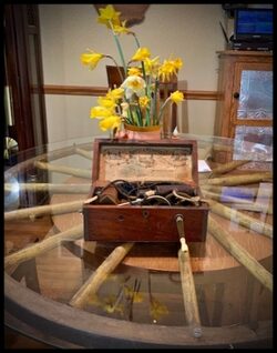 (By the way, the glass-top table was crafted using a wheel from the Spiker Buggy. The daffodils are from Grandma Gay’s garden on the hillside at the Spiker farm.)