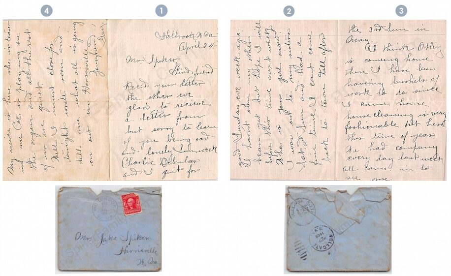 Mike said, “I found the ‘dating’ letters in a box of items we removed from Mom and Dad’s house in Pennsboro. I had seen the box years ago, but it disappeared. I assume Dad found the box as he cleaned out the Spiker farmhouse after Grandma died. She would have kept them since she was a known saver of documents. I also assume they were stored in the attic at the farmhouse, safe during the 1950 flood when many pictures and other family heirlooms were destroyed. Since the letters were all mixed together, I separated them and organized them” by year.